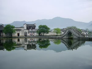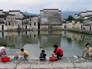 Die Reise, vorbei an abgeernteten Reis- und Maisfeldern, auf denen die Wasserbüffel sichtlich froh sind endlich eine ruhigere Kugel schieben zu können, dauert ca. eine Stunde. Dann – und jetzt heißt es, Mini-Budget-Reisende aufgepasst – steige ich am Busbahnhof einer charismalosen Kleinstadt aus und denke: Das ist jetzt aber noch nicht Hongcun, oder? Wo sind die malerischen Bauten? Ich gehe zum Fahrkartenschalter und frage nach einer Karte für Hongcun. Ja, sagt die Tante, einmal rechts um die Ecke. Draußen an der Ecke treffe ich eine Gruppe junger Leute aus dem Bus wieder, die auch nach Hongcun wollen; aber erst mal, es ist halb zwölf, wolle man was essen. Ein Mädchen aus der Gruppe zeigt mir, dass der Bus an der Kreuzung hinter der Brücke über den Fluss schon warte. Zwei Yuan. Ich überquere also die Brücke, da wartet wirklich ein Bus. Ich steige ein, entrichte meinen Fahrpreis und lande – und jetzt heißt es, Mini-Budget-Reisende, die ihr via Google auf diese Seite gestoßen seid, weil ihr Huangshan+Unterkunft+China oder Hongcun+Urlaub+billig eingegeben habt, doppelt aufgepasst –, also, ich lande an einer Stelle (zweite Brücke über den Fluss nach Ortseingang), wo weit und breit keine Eintrittsgebühr für dieses Weltkulturerbe zu entrichten ist. Schon der 40-Mark-Berg gestern hatte ja gewisse Verstimmungen bei mir ausgelöst und nun stelle man sich vor, man soll 16 Mark (2 % eines gehobenen Monatsgehalts in der Volksrepublik) Eintritt zahlen, damit man Bad Wimpfen oder Rothenburg ob der Tauber betreten kann! Und wie will man das eigentlich sicherstellen? Die Stadt mit Checkpoint-Charlie-Häuschen umzingeln? Ob das so einem Städtele nicht manches von seinem diskreten Charme rauben könnte? Nicht anders ist es hier.