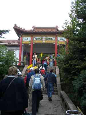 Heute ist der Zijin- oder Purpur-Berg dran. Er befindet sich westlich vom Xuanwu-See, den ich auf meinem Weg passiere, und ist Teil eines riesigen Naherholungsgebietes, in dem sich auch das Sun-Yat-Sen-Mausoleum befindet, das ich Mitte September (sin-o-meter berichtete) als Teil der Spezialveranstaltung für ausländische Lehrkräfte bereits besichtigen durfte. Das ganze Unterfangen ist im Grunde eine Miniatur-Ausgabe meiner Huangshan-Tour: Im Verhältnis zur Größe des Areals sind genauso viele Leute auf den steinernen Treppen unterwegs. Wie dort gibt es eine parallele Seilbahn für Faule und Fußkranke und einen tiefer gelegenen Antennengipfel, wie dort stellt sich mit zunehmender Dienstgipfelhöhe auch wieder der berüchtigte Clooney-Effekt  (sin-o-meter berichtete) ein. In einem Rast-Pavillon finde ich mich unvermittelt in einer kichernden vierköpfigen Mädchengruppe wieder; die trauen sich noch nicht. Wenig später aber darf ich für eine gemischte Gruppe posieren (das peinliche Fragen übernehmen die Jungs). Oben auf dem höchsten Punkt, dem Purpur-Gipfel, treffe ich sie wieder. Eines der Mädchen hat das Kunststück fertig gebracht, ihr Kuscheltier, einen ca. einen Meter langen hellblauen Plüsch-Delfin, bis hierher auf dem Arm zu tragen. Das ist wahre Liebe! Immerhin sieht der Delfin mit seinen Knopfaugen ungefähr so viel von der Tiefe, die wir überragen, wie ich, denn heute ist ganz Nanjing in einen dichten Dunstschleier gehüllt.